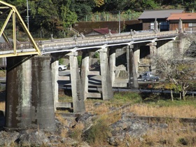 池原ダムから国道をうねうねと下っていくと、前方の谷底に本橋が姿を見せる。古いタイプの橋であるかもしれないが決して古ぼけてはいない雄大な姿に、これだけの橋を建設しようとした村人の熱意と、それに応えてこの山村に一流の技術を投入した技術者の健気さが強く感じられた。顕彰されるべき橋梁である。
